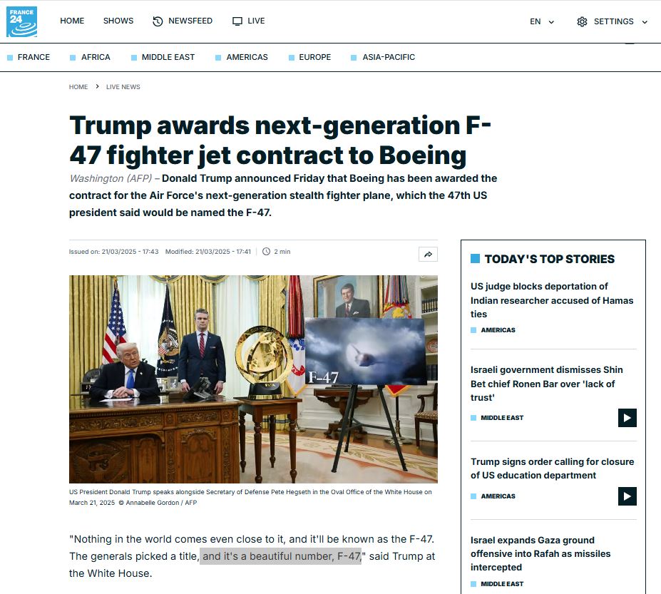 21st March 2025 – US President Donald Trump awarded Boeing a $20 billion contract to build the US Air Force’s most sophisticated fighter jet, which will be called the F-47.