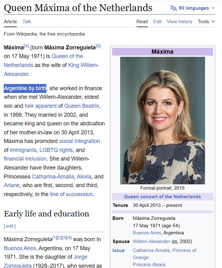 Queen Máxima of the Netherlands (House of ORANGE) is ARGENTINE by birth