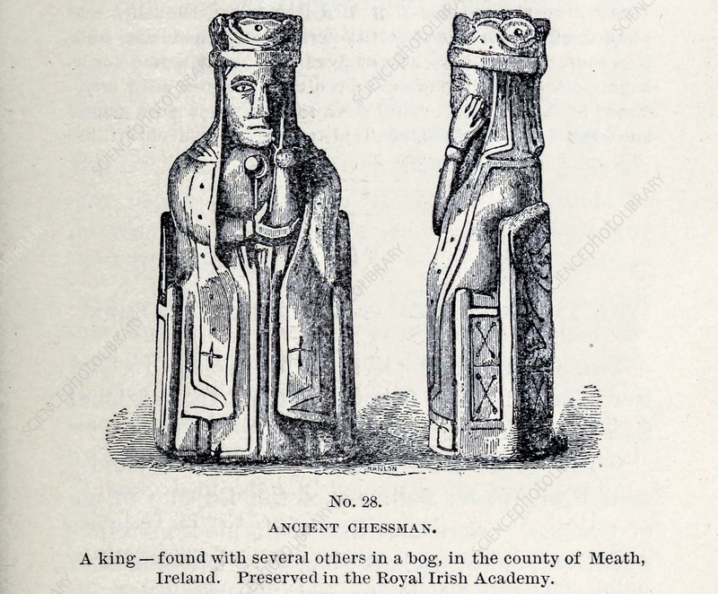 Illustration of an ancient chess piece – a king, found with several others in a bog, in the county of Meath, Ireland. Preserved in the Royal Irish Academy. From the book ‘Athletics and manly sport’ by John Boyle O’Reilly (1844-1890). Published in Boston, by Pilot publishing company in 1890.