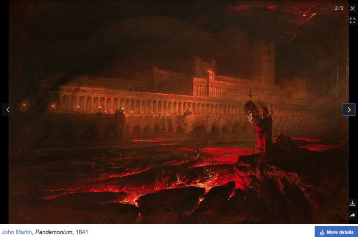 John Milton invented the name in Paradise Lost (1667), as “A solemn Council forthwith to be held at Pandæmonium, the high Capitol, of Satan and his Peers” (1.754-756), which was built by the fallen angels at the suggestion of Mammon.
