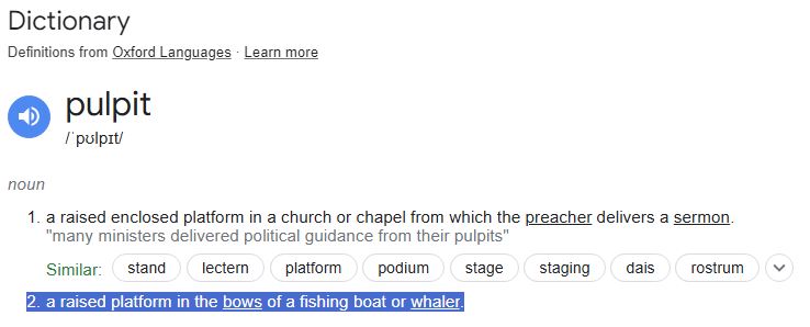 PULPIT – A raised platform at the bow or stern of a FISHING vessel