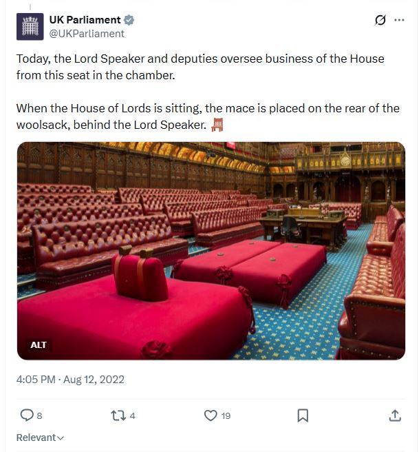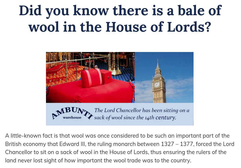 The House of Lords Speaker has been sitting on a WOOLSACK since the 14th Century.